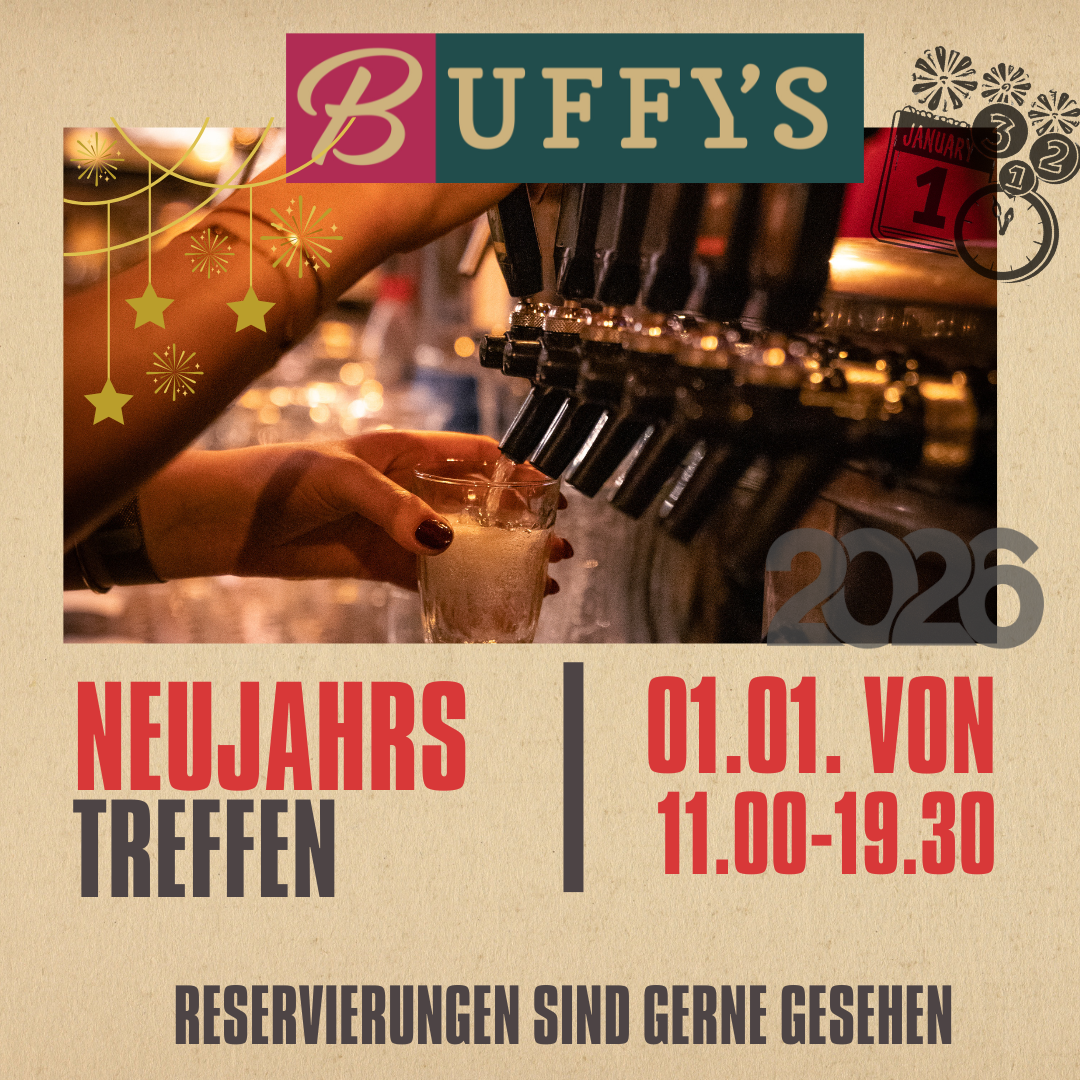 Neujahrstreffen 2026 – die zweite Runde! ✨ Letztes Jahr war Premiere – dieses Jahr machen wir’s wieder! 🥳 Am 01. Januar 2026 öffnen wir von 11:00 bis 19:30 Uhr unsere Türen zum gemütlichen Start ins neue Jahr. Neben guten Vorsätzen und bester Stimmung gibt’s mittags noch eine kleine Stärkung, damit die ersten Getränke nicht komplett alleine da stehen 😉 🍽️🍻 👉 Reservierungen sind gerne gesehen! Wir freuen uns auf einen entspannten Neujahrstag mit euch im Buffy’s! 💫