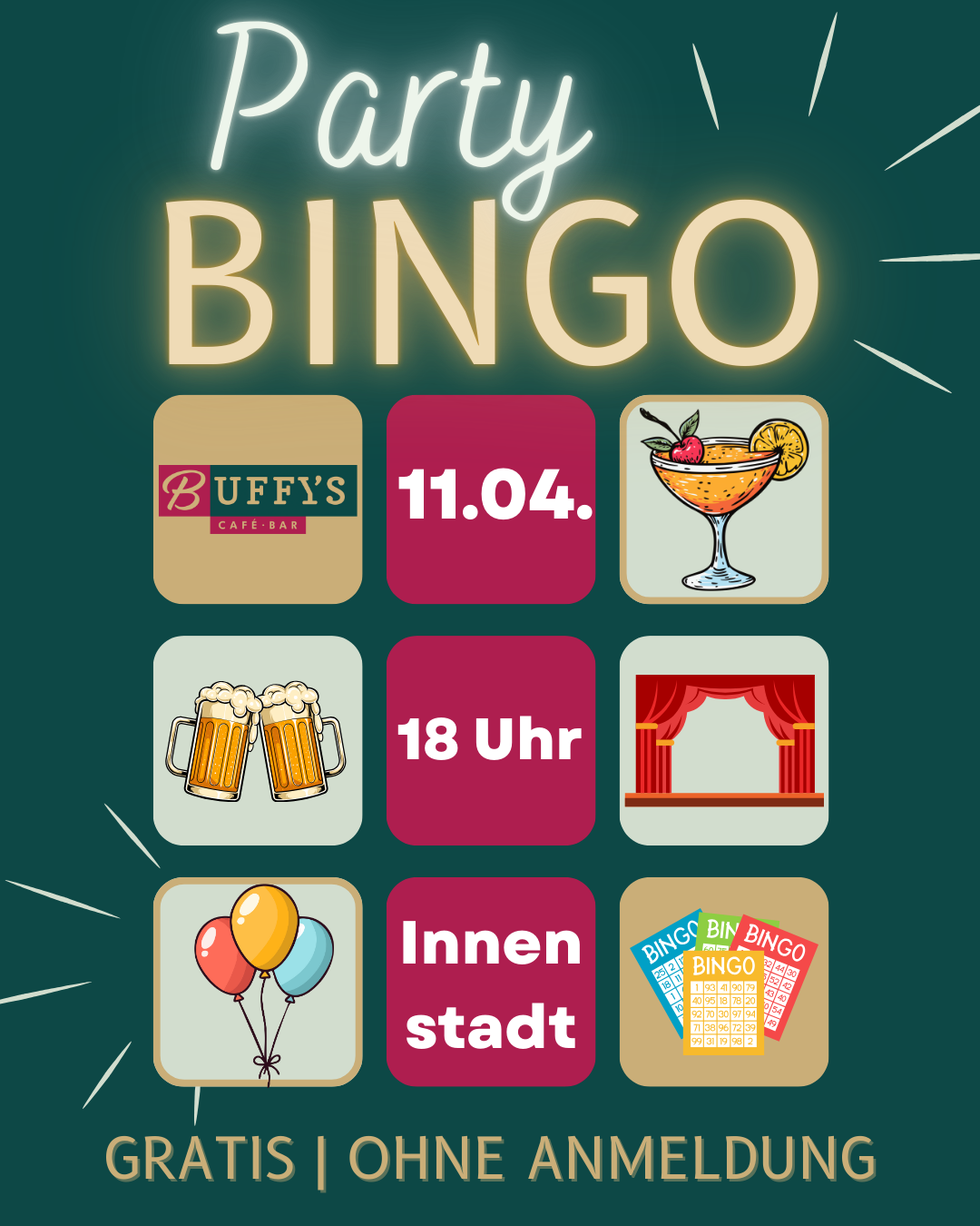 Party Bingo – das etwas andere Bingo-Erlebnis! 🎉 Am 11.04. ab 18 Uhr wird’s auf der Open Air Bühne am Rathaus alles andere als gewöhnlich: Euch erwartet ein Bingo-Abend mit verrückten Momenten, großartiger Musik und jeder Menge Spaß! ✨ Moderiert von Tom Wolf 🎁 Tolle Preise zu gewinnen 🎶 Gute Musik & besondere Highlights 🎈 Beste Stimmung garantiert 👉 Eintritt kostenlos – keine Anmeldung nötig! Kommt vorbei, bringt eure Freunde mit und erlebt Bingo neu!